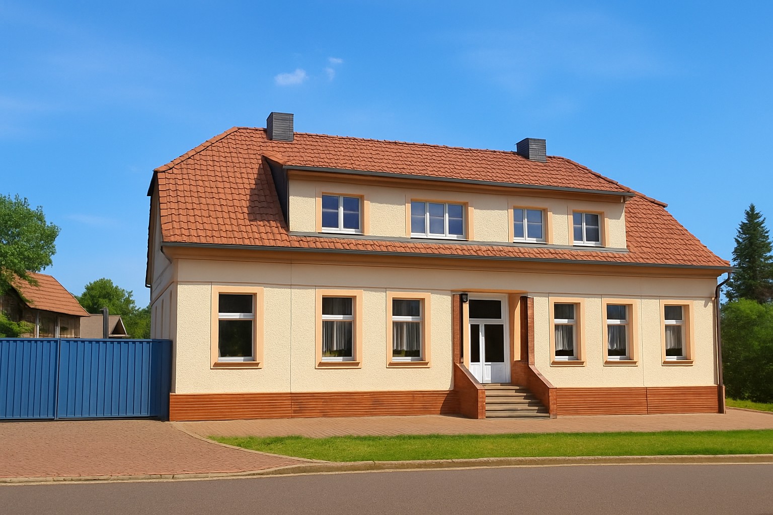 Ausgestattet ist das Haus mit weißen, doppelt verglasten Kunststoff-Thermofenstern, welche nach 1995 eingebaut wurden. Die Elektrik wurde nach 1990 komplett saniert. Das Dach ist ca. 1992 gedämmt und mit einem roten Tonziegel gedeckt. Es sind Dachrinnen und Fallrohre aus Zink verbaut. Die Fassade wurde ca. 2011 mit einem durchgefärbten Putz und einem gelben Klinkersockel versehen. Die Wohn- und Gewerbeflächen werden über die 2018 eingebaute Gaszentralheizung / Brennwertheizung mit Wärmeenergie und Warmwasser versorgt.