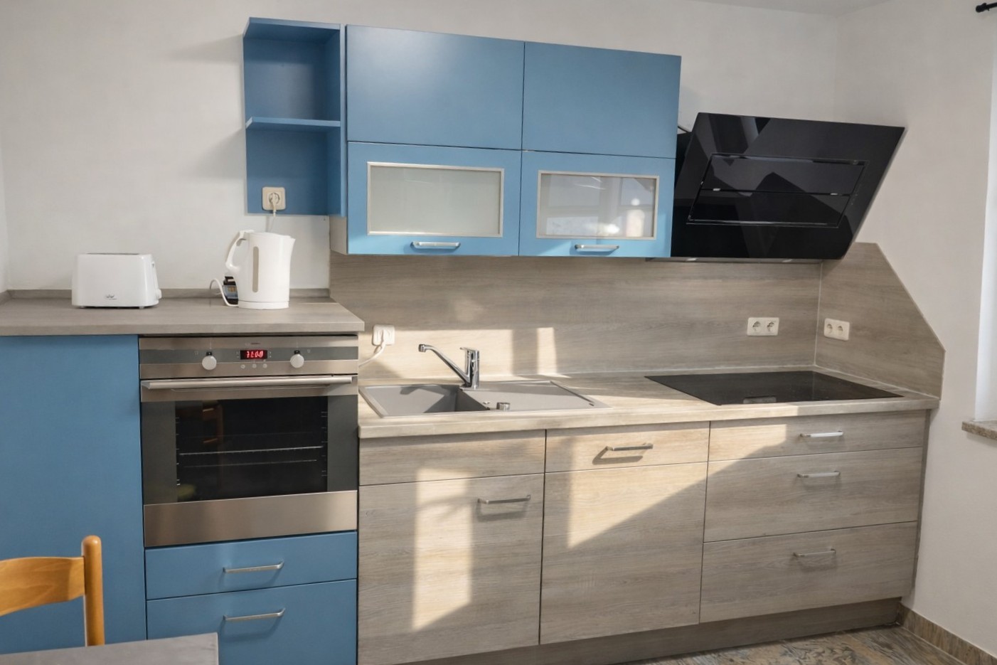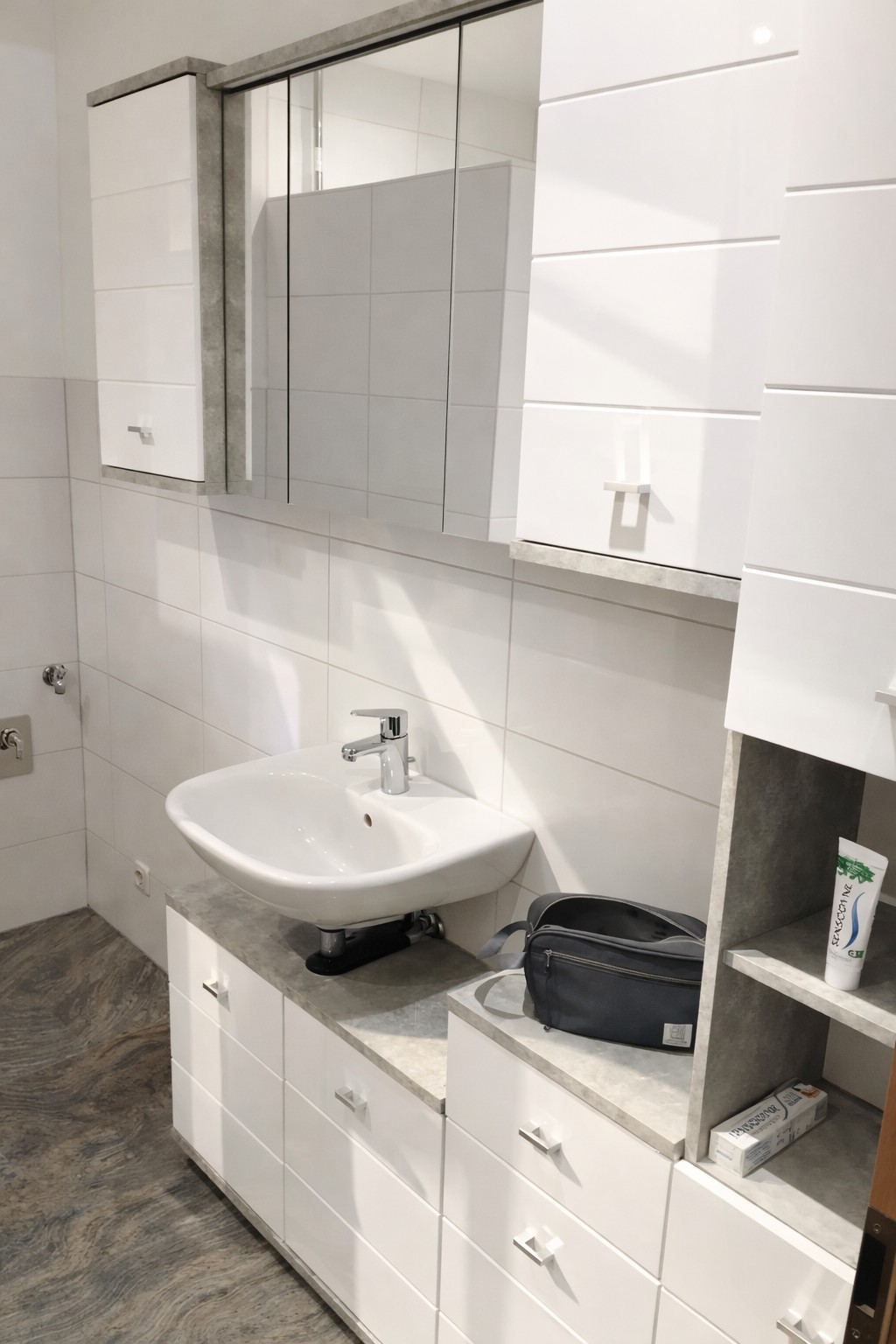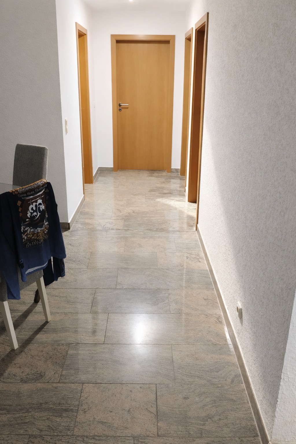 Die Böden der drei Schlaf- bzw. Wohnräume sind mit klassischem Teppichboden versehen, wohingegen Küche, Wohnzimmer und Bad mit pflegeleichten Fliesen ausgestattet wurden. Die hochwertige Einbauküche lässt keine Wünsche offen und verfügt über moderne Markengeräte, darunter ein Induktionskochfeld, ein Backofen, ein Geschirrspüler sowie ein Kühlschrank.