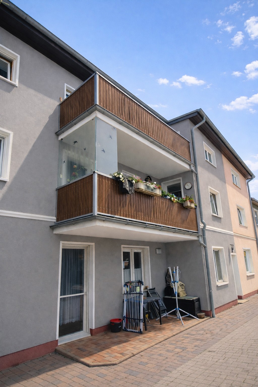 Die Erdgeschosswohnung verfügt über eine Wohnfläche von ca. 44,60 m² und umfasst zwei Zimmer, eine Küche, einen Flur sowie ein Duschbad. Ergänzt wird diese Wohneinheit durch eine Terrasse, die einen direkten Zugang zum Außenbereich bietet und den Wohnkomfort zusätzlich erhöht.