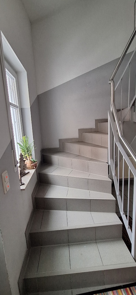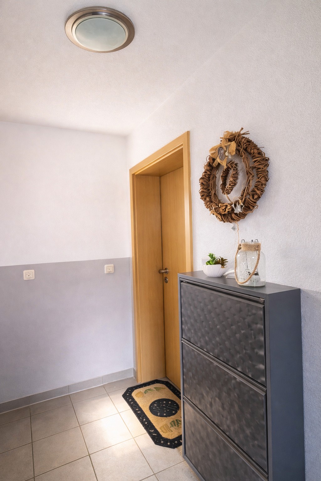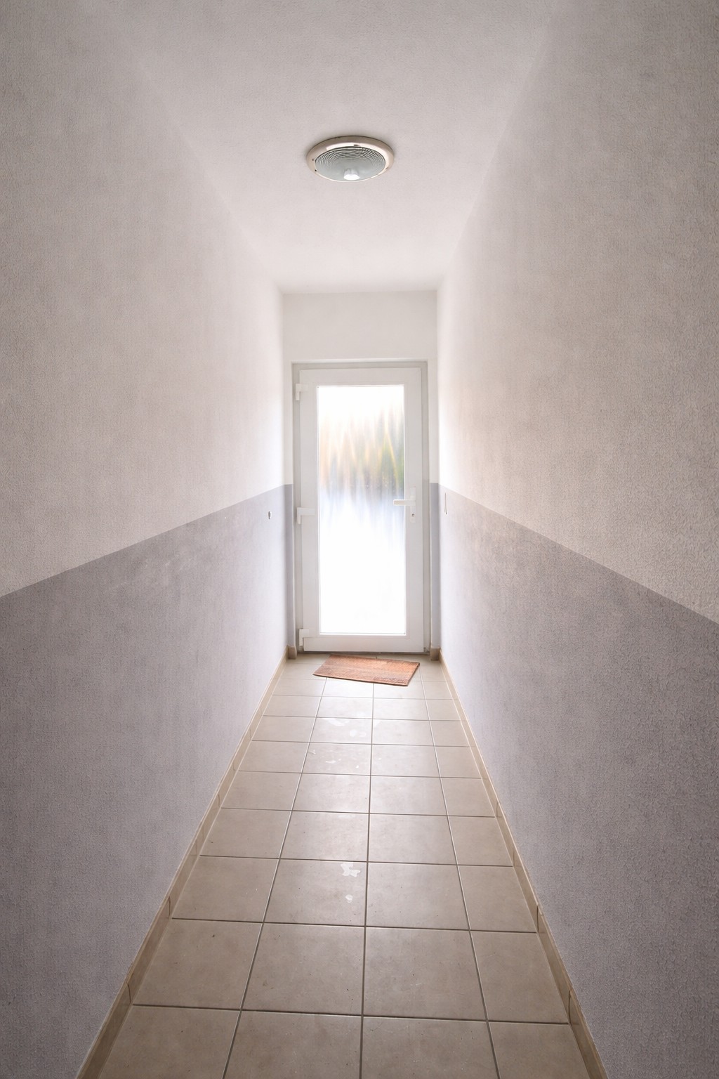 Im Innenbereich sind die Wohnräume überwiegend mit Laminatboden ausgestattet, während in den Fluren und Bädern Fliesen verlegt wurden.