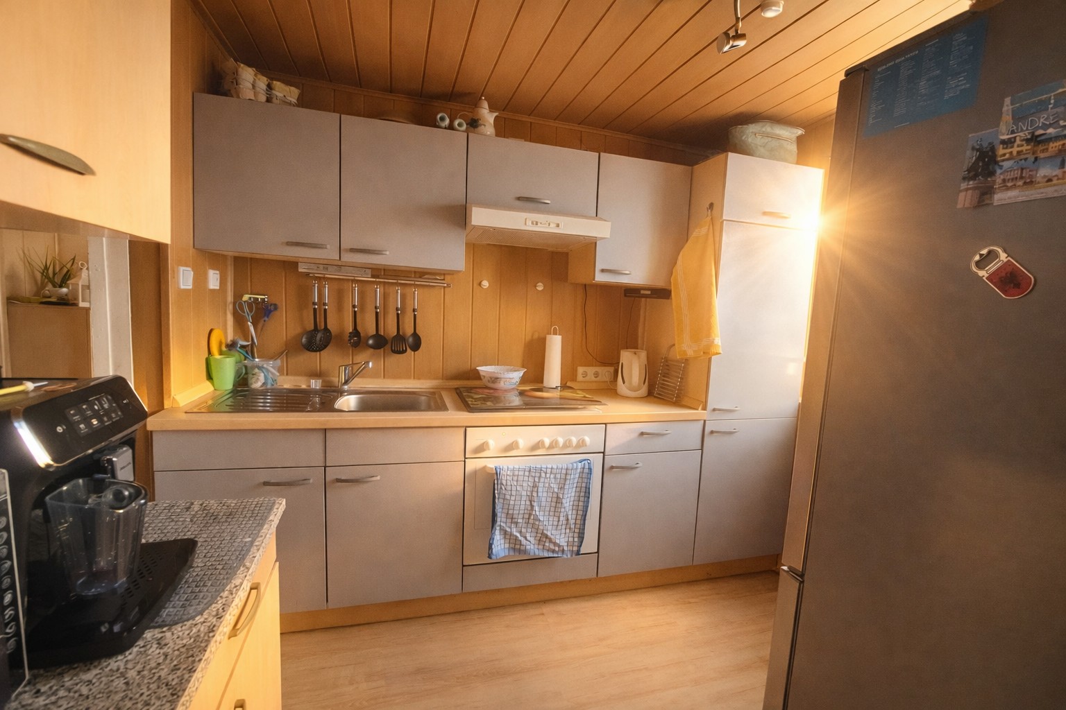 Im Erdgeschoss (ca. 82 m² Wohnfläche) befinden sich drei Zimmer, eine großzügige Wohnküche, ein Flur sowie ein modernisiertes Duschbad. Das Badezimmer wurde ca. 2023 saniert und ist mit einer bodengleichen Dusche ausgestattet, wodurch ein zeitgemäßer Komfort geboten wird. Die geräumige Wohnküche bietet ausreichend Platz für einen Essbereich und bildet einen zentralen Treffpunkt des Wohnens.